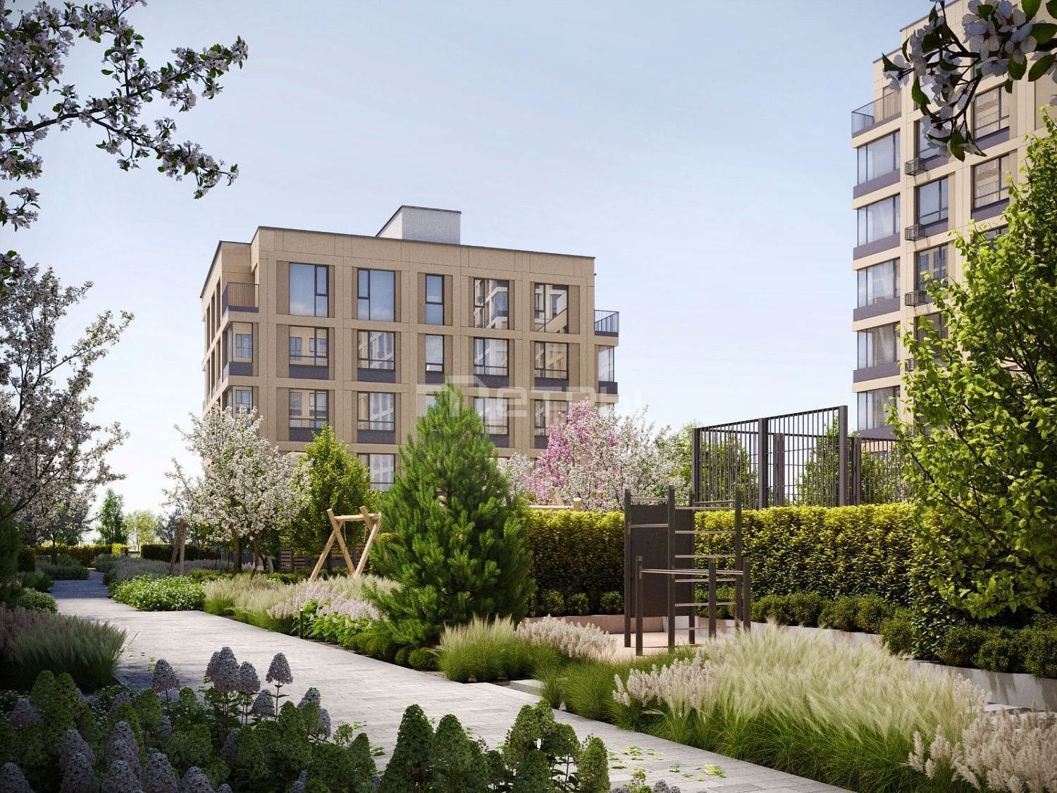 Ландшафтный дизайн: Более 30% территории отведено под озеленение. Во дворе расположены современные игровые площадки из эко-материалов и Workout-зоны для занятий спортом на свежем воздухе.