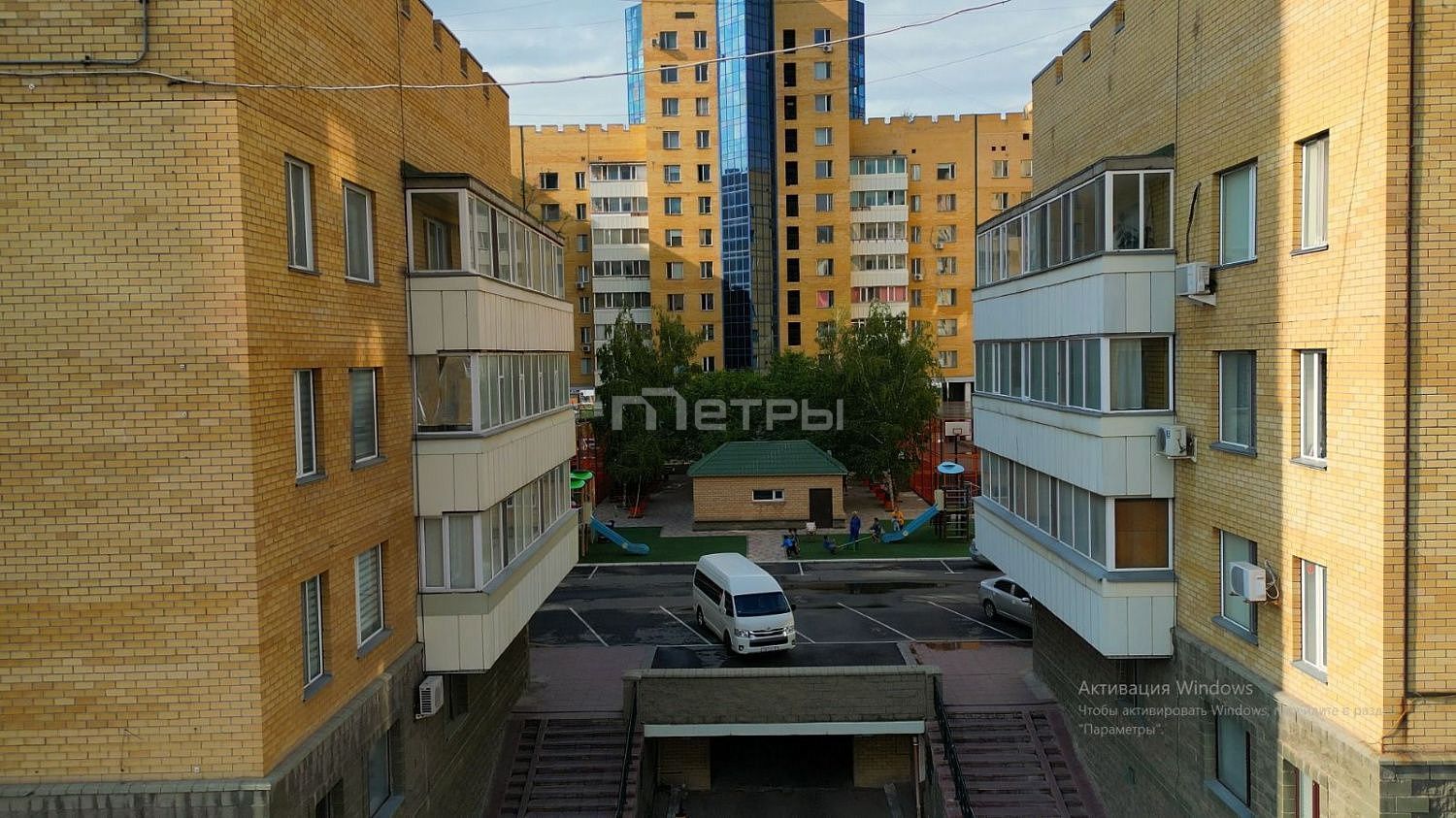 Безопасность: Двор приподнят над уровнем улицы, что создает приватную и защищенную атмосферу. Пандусы для входа и въезда выходят на проспект Абая и улицу Омарова.